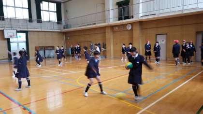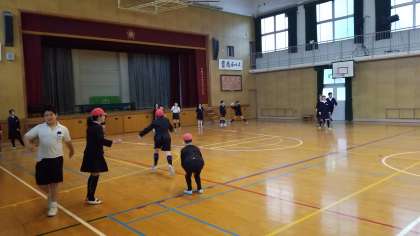 休み時間、体育館で活動しています。今日は5年1組がドッジボールをしています。