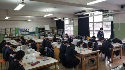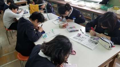 科学工作の様子です。プラ版で創作活動をしています。みんなの姿勢がいいですね。