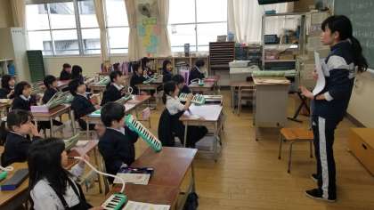 1年2組の音楽の様子です。「まだ音はだしませんよ」と担任の先生に叱られていました。みんな叱られて成長していきます。