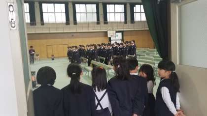 朝の時間を活用して、5年生が体育館で卒業式の練習をしています。その様子を1年生が静かに見学しています。