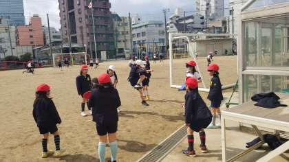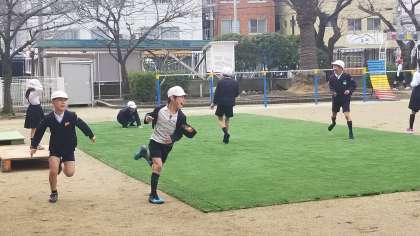 休み時間の様子です。朝の雨もあがり、青空が広がりました。運動場は少し湿っていますが開放しました。子どもたちも「やったー」と元気に遊んでいます。