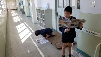 写真下は、子ども新聞を読んで、図書館の開館を待っています。