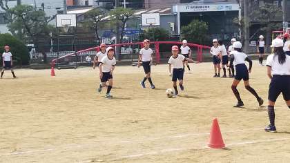 4年1組の体育の様子です。サッカーゲームをしています。