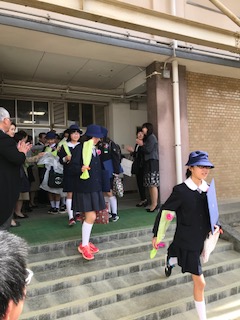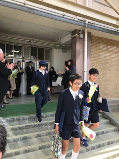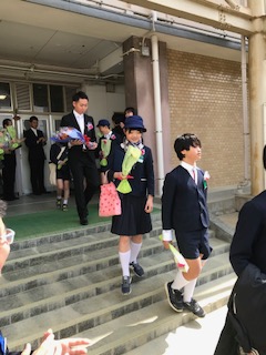 保護者から花を受け取り、最後のお別れです。