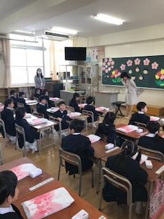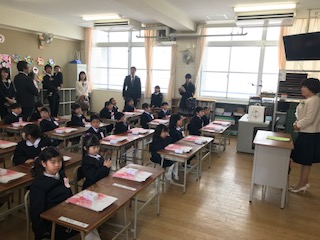 入学式終了後、各教室で担任の先生のお話を聴きました。その後、体育館でクラス毎に記念撮影をおこないました。