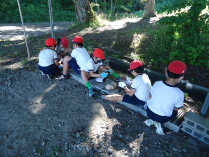 明日の絵描きのために、焦げた杉板を古タオルなどを使って磨きます。