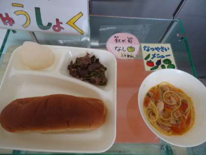 今日の給食には、夏野菜のトマトとピーマン、秋の果物の梨が同時に登場です。