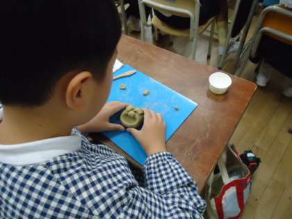 図画工作科の時間に、土粘土を使ってシーサーを作りました。