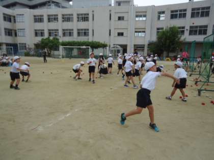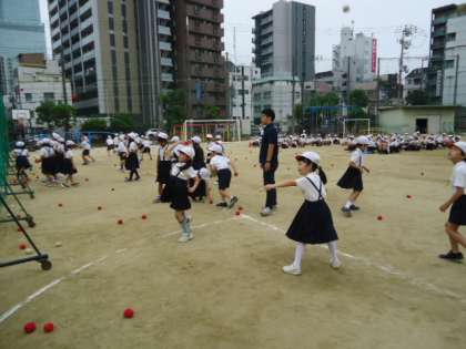 今朝の体育朝会は、紅白玉を使った玉投げです。