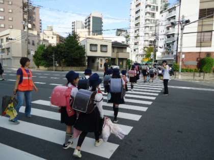 今朝の登校指導・PTA交通安全指導には、天王寺警察・天王寺区防犯協会・天王寺区役所安全パトロール隊の皆さんにも参加しいただき、いつもよりたくさんで児童の登校を見守りました。