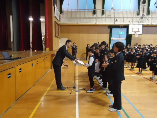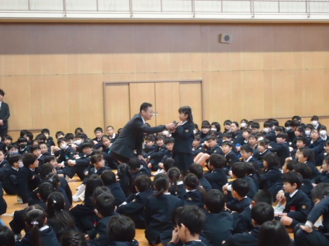 市歌と校歌に続く校長講話では、みんなに2学期頑張ったりできるようになったりしたことを考えてもらい、その場で何人か発表してもらいました。