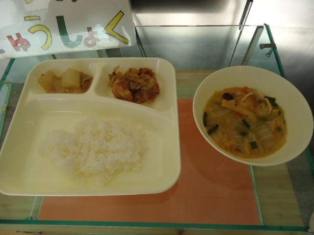 2学期最後の給食は、具だくさんの温かいみそ汁などの和食メニューです。