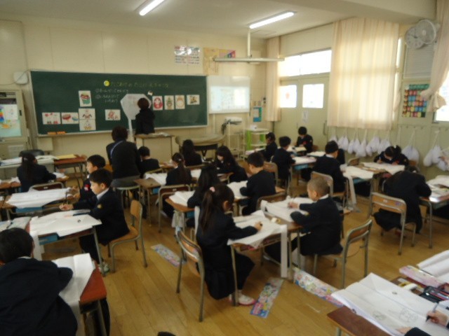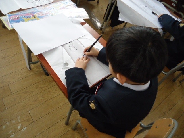 先生が見本でいろいろなお正月の縁起物の絵を見せてくれたので、好きなものを選んで描きました。