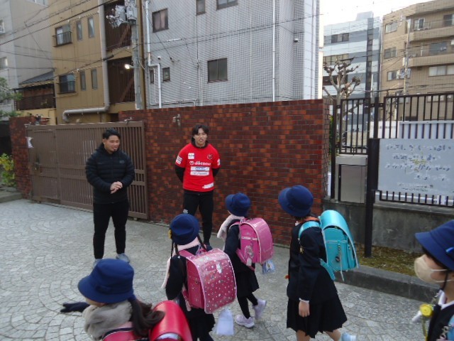 今日のあいさつ運動は、スペシャルゲストとしてプロラグビーチームのレッドハリケーンズ大阪の佐藤選手や土橋選手らにお越しいただきました。