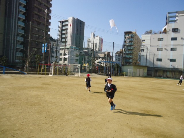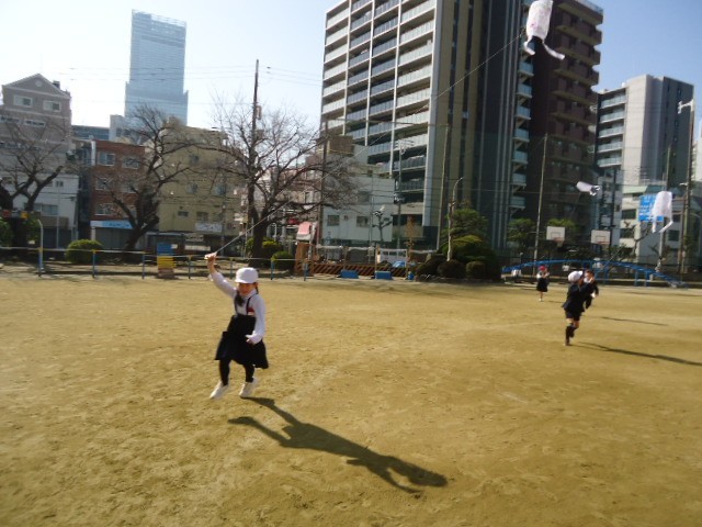 ひもを伸ばすともっと高く上がるので、みんな大喜びで凧あげを楽しみました。