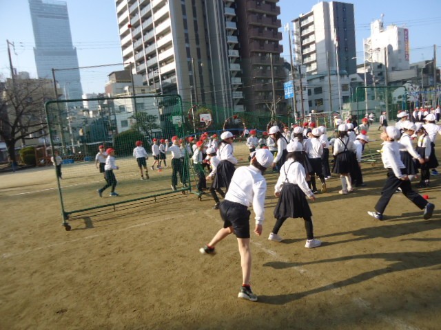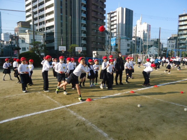 今日の体育朝会は偶数学年が運動場と講堂で投げる運動に挑戦しました。