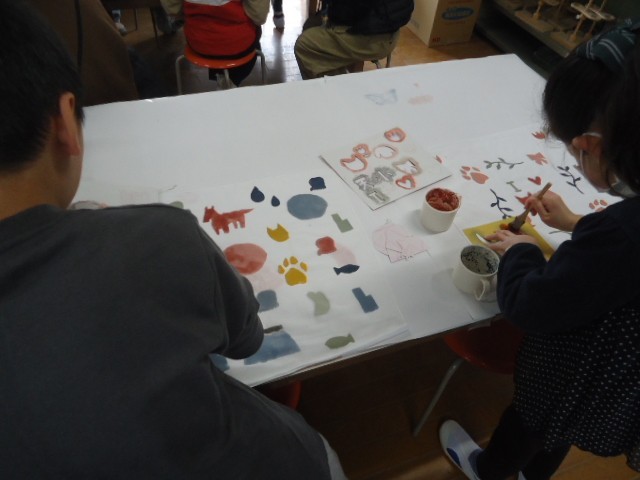 型紙作りをした後にベンガラという顔料を使って色を塗り、バンダナのデザインをしていきます。