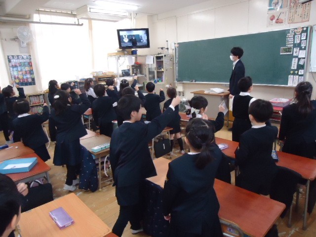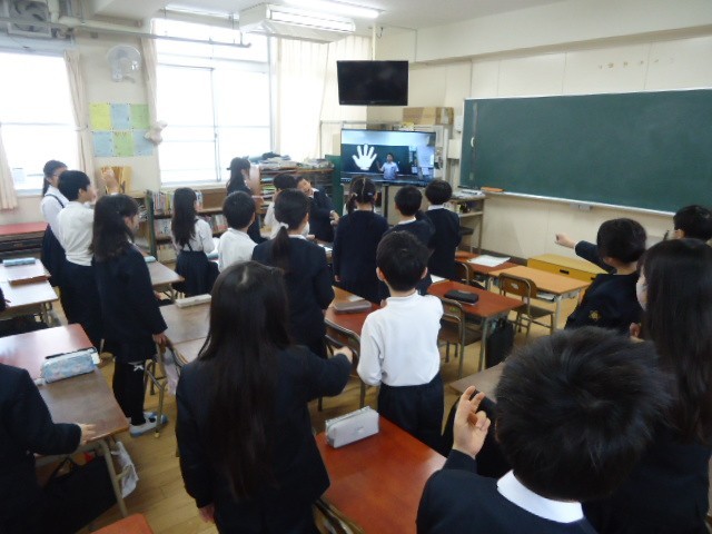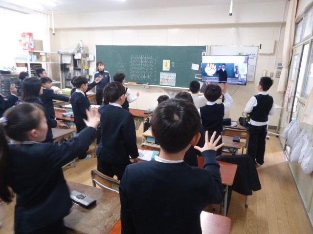 今日の体育朝会は、1・3・5年生の奇数学年は教室で「シナプソロジー」をしました。