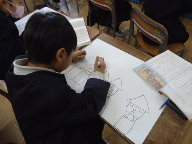 国語科の学習で読んだが「お手紙」や「かさじぞう」などのお話の絵を描きました。