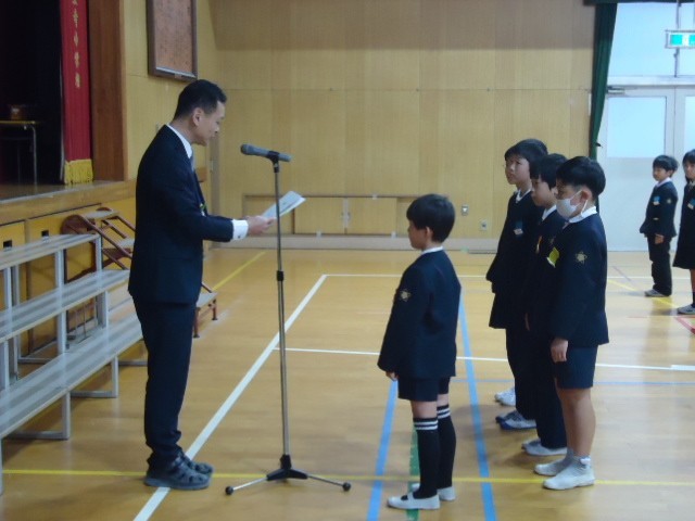 大阪市歌と校歌を歌ったあと、各学年の代表児童に修了証を手渡しました。