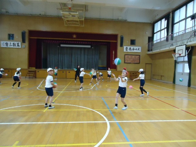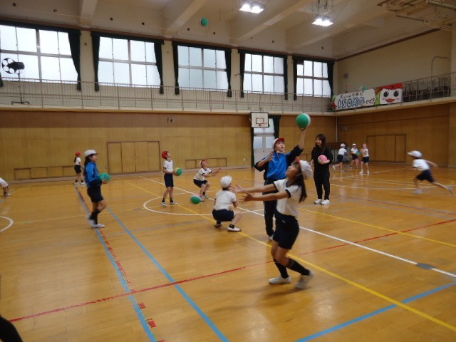 体つくり運動では、ドッジボールなどのゲームとは違って、投げ方や取り方を工夫することで動きのバリエーションを増やす学習をします。
