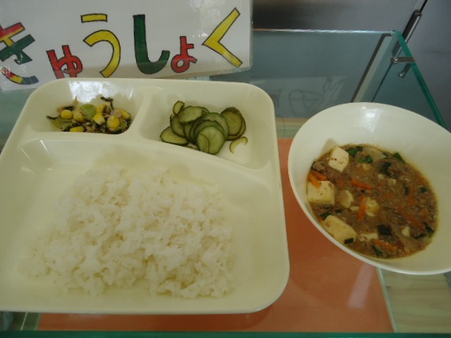 給食では、赤みそや醤油などで味付けし、豆板醤で辛味をつけています。