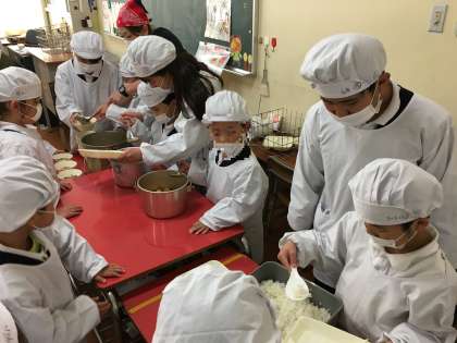 はじめての はいぜん 公開日 2019/04/12 更新日 2019/04/12 1年生 「もう少し、ご飯入れてもいいよ。」 「じょうずにできたね。すごいね。」 6年生が1年生に給食の配膳の仕方を教えています。 しっかり聞いてじょうずに配膳しようね。 いいね(0)