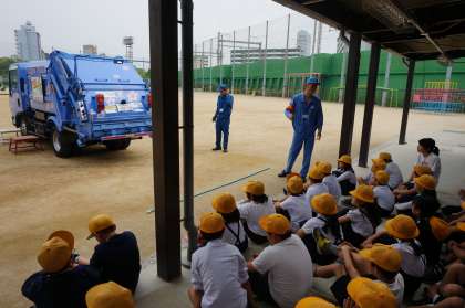 大阪市環境局の方に来ていただいて、ごみの分別についての授業を行いました。