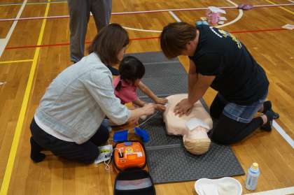 AEDは、小さな子どもでも扱えるような簡単な機械であり、海外では実際に5歳の子どもが使用して命を救ったという実例も紹介していただきました。参加していただいたお子さんにもお家の人と一緒にAEDの操作にチャレンジしてもらいました。