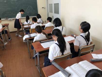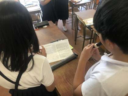 休み時間には6年生が5年生の教室に行って教える様子も見られます。5・6年生で協力して素晴らしい演奏になるようがんばっています。