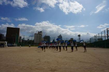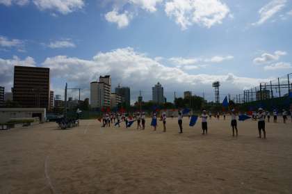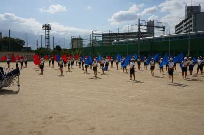 運動会の練習も中盤に入り、高学年はフラッグを使って演技の練習をしました。今日は、実際に運動場に出て、場所の確認やリズムの確認などを行いました。
