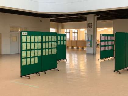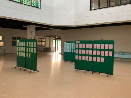 また、玄関ホールで先日実施しました「栄小ハートフルタイム お題:できた!わかった!!がんばった!!!」の児童のワークシートを掲示しております。