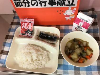 給食では、節分の行事献立として、いわししょうがじょうゆかけといり大豆が登場します。