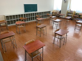 ・学級を2つに分けて活動します。写真のような机を広い間隔に配置します。