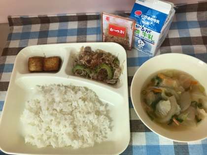 今日の給食は、「ごはん、牛乳、ゴーヤチャンプルー、すまし汁、あつあげのしょうがじょうゆかけ」でした。