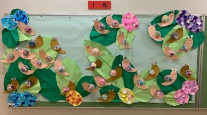 1年生では、ひとりひとりが作ったカタツムリが大きなあじさいの葉っぱの上にのっています。