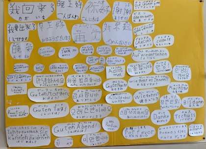 いろいろな国のあいさつ 公開日 2020/07/21 更新日 2020/07/21 5年生 5年生の教室には、世界のいろいろな国々のあいさつが掲示してあります。 子どもたちが知っている言葉を書いたり、本で調べて書きだしたりしています。 たくさんの言葉を覚えて、いろんな国の人とお話できるようになるといいですね。 いいね(0)
