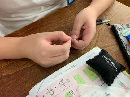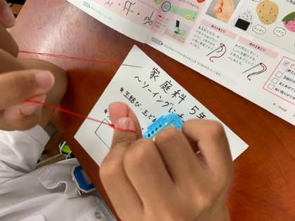 まずは糸通し。針に糸を通します。肩に力が入りすぎてなかなか思うように針に糸が通らなかったり、一度通った糸が抜けてしまったり。通った時には「通った!」とうれしそうな声があがりました。