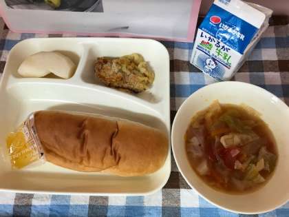 今日の給食は、「コッペパン、牛乳、豆乳マカロニグラタン(米粉)、トマトスープ、なし(二十世紀)、マーマレードジャム」でした。