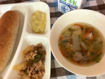 今日の給食は、「ライ麦パン、牛乳、豚肉と野菜のケチャップソテー、スープ、スイートポテト」です。