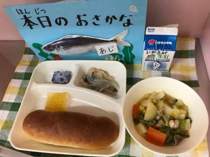 今日の給食は、「コッペパン、牛乳、あじのレモンマリネ、てぼ豆のスープ、固形チーズ、マーマレード」でした。