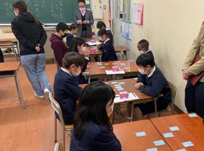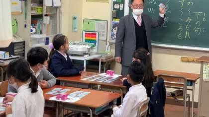 大阪市立磯路小学校の糸井校長先生にゲストティーチャーとして来校していただき、五色百人一首の授業をしていただきました。