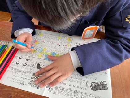 2年生の教室では、みんなでパズル塗り絵をしながら、歯の勉強をしました。