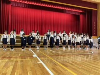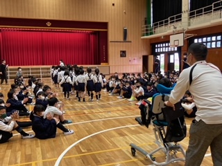 「よろしくお願いします‼」元気よい1年生のあいさつが、講堂に響きました。