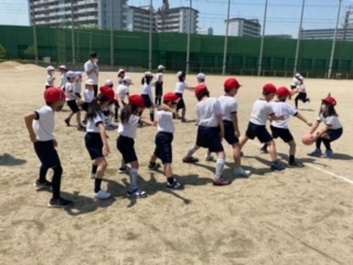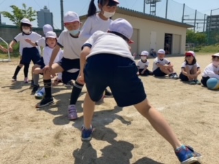 「足を大きく広げて!」 「まっすぐ並ぼー!」 ボールを使って、チーム対抗リレー。