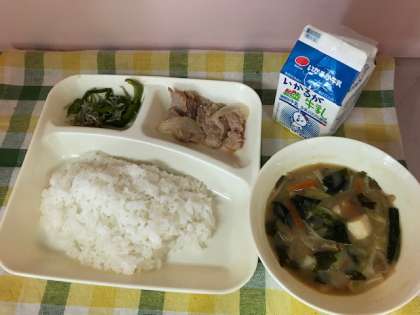 今日の給食は、「ごはん、牛乳、豚肉のしょうが焼き、みそ汁、じゃこピーマン」でした。