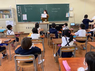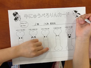 栄養教諭の大浦先生が牛乳についての授業をしています。 毎日、牛乳を飲んで、 カルシウムをとりいれましょう。