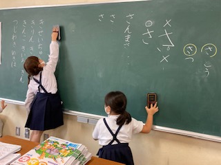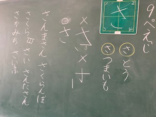 休み時間になると、 子どもたちが黒板の文字を消してくれます。 「さ」よなら 「さんまさん」