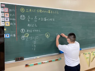 分数のかけ算 公開日 2021/05/19 更新日 2021/05/19 6年生 分数のかけ算が始まって3回目の授業です。 自分がどのように計算したか、黒板に書いています。 よーーーく見てください。 分数の線を、 自分の定規を使って引いているではありませんか!? なんとかわいい! 学校では最高学年の6年生。 やっぱりかわいい! いいね(0)