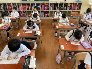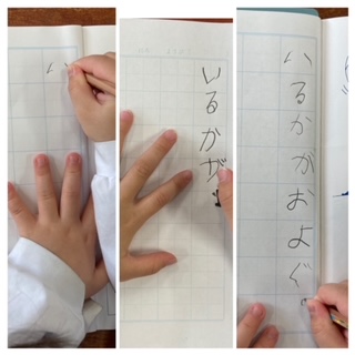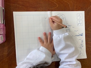1年生がノートデビューをしました! まっさらのノートの大きなマスに、 小さい手が、とってもかわいい!